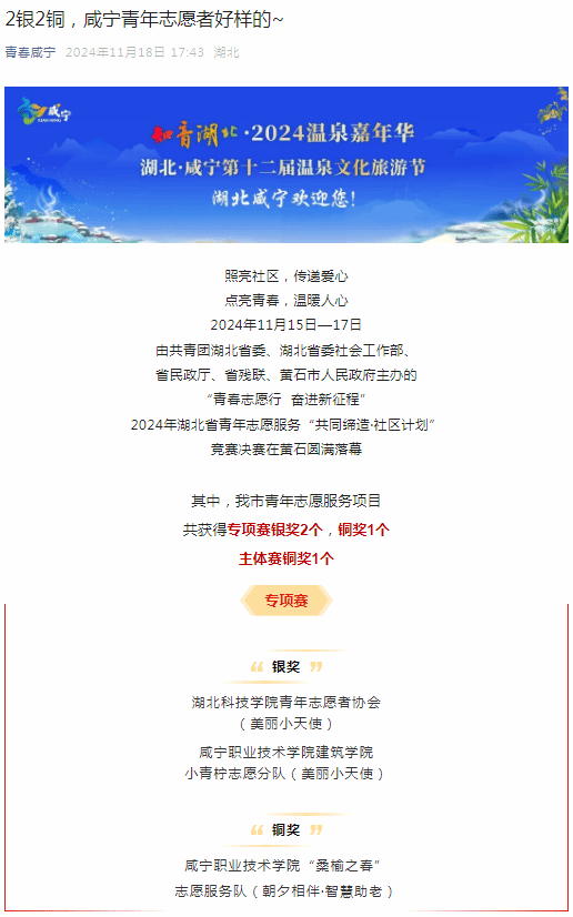 2021年和2024年,小青柠志愿服务队连续入选湖北省本禹志愿服务队,其志愿服务项目曾荣获咸宁市最佳志愿服务项目、湖北省青年志愿公益项目大赛铜奖等荣誉。这些成就不仅是对队员们辛勤付出的认可,也是对咸宁职业技术学院在大学生育人成长方面逐渐形成的常态化、长效化机制的肯定。