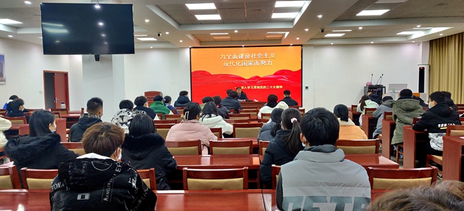 他指出党的二十大是一次高举旗帜、凝聚力量、团结奋进的大会,为新时代新征程党和国家事业发展指明了前进方向、确立了行动指南,具有划时代、里程碑意义。全体师生要全面学习、全面把握、全面落实党的二十大精神,不断深化对新思想、新论断、新部署、新要求的学思践悟,推动党的二十大精神入脑入心、落实落地。要深刻领悟“两个确立”的决定性意义,自觉做“两个维护”的忠诚践行者,始终在思想上、政治上、行动上同以习近平同志为核心的党中央保持高度一致。