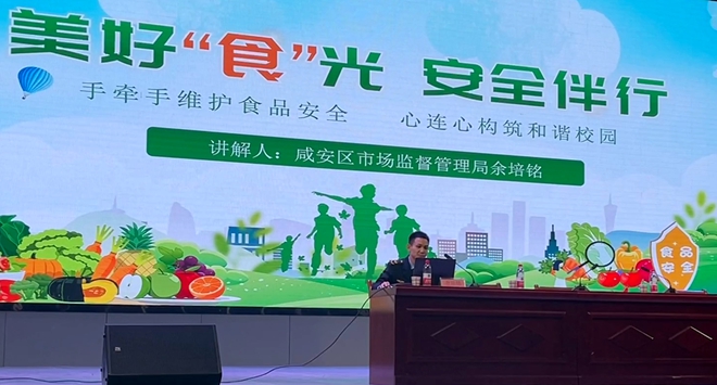 咸安区市场监督管理局余培铭做专题讲座《美好“食”光 安全伴行》,讲座从食品安全、街边小吃大揭秘、十大“垃圾食品”、食品购买注意事项等方面讲解了与大家日常生活相关的食品安全常识,同时还引入了大量日常生活中的食品实例,重点强调了生活中“三无食品”的鉴别方法及食用“三无食品”的严重性和危害性,提醒师生购买食品时要注意食品卫生标准,认准食品生产许可,在打开食品包装前要仔细观察辨别。