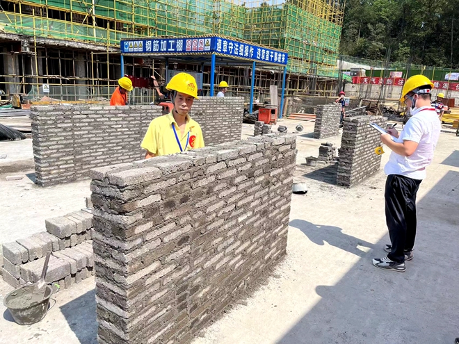 激烈的比赛现场,吸引了现场嘉宾的驻足观摩与热烈讨论,普及了墙体砌筑知识。比赛过程中,裁判员对选手的组砌方式和操作规范程度进行了过程评判,比赛规定用时结束后,裁判员对作品的完成度、完整度、垂直度、平整度、美观度以及灰缝厚度、灰缝平直度、组砌正确率等检查项目进行了仔细检查和规范评分,现场宣布了评判结果与获奖名次,最终3名选手分别获得金、银、铜奖,3人荣获敬业奖。