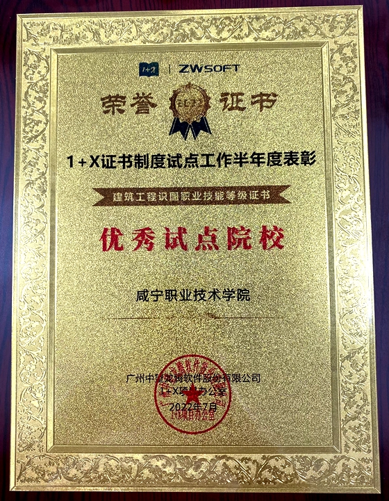 近日,1+X建筑工程识图职业技能等级证书培训评价组织、国内最大的CAD平台软件供应商广州中望龙腾软件股份有限公司授予我校“优秀试点院校”荣誉称号。
