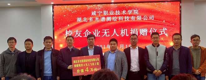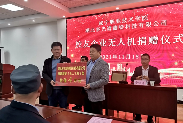 仪式上,湖北多光谱测绘科技有限公司向我校捐赠大疆精灵4无人飞机2架,价值4万元,用于工程测量技术专业课程实训及1+X无人机摄影测量职业技能等级证书考核培训。汪耀武代表学校接受捐赠。