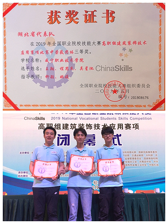 6月1日,2019年全国职业院校技能大赛高职组“建筑装饰技术应用”赛项在浙江杭州举行。来自全国31个省、市、自治区以及新疆生产建设兵团的共79支高职院校代表队237名选手参加,我校作为湖北省代表队之一参赛,并荣获团体三等奖。