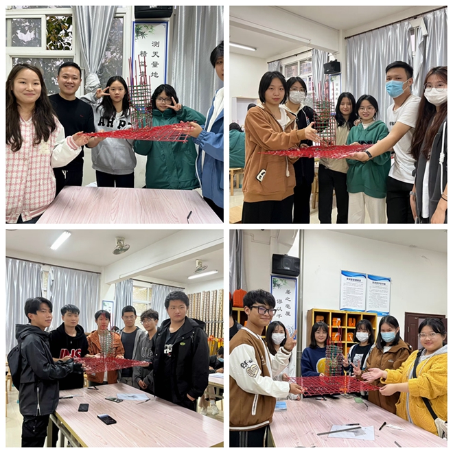 下午30名学生分成5组在讲师的指导下,运用上午计算成果进行钢筋绑扎实操,学生热情高涨,整个课堂氛围认真细致,组员相互配合,从而协作完成最后成果。