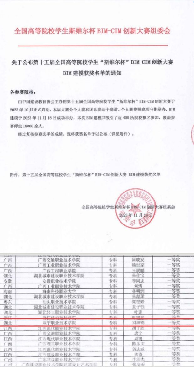 11月18日,由中国建设教育协会主办,深圳市斯维尔科技股份有限公司承办的第十五届全国高等院校学生“斯维尔杯”BIM-CIM创新大赛BIM建模赛项落下帷幕,我院2022级工程造价专业学生刘源锦同学在此次比赛中脱颖而出,取得一等奖的好成绩。