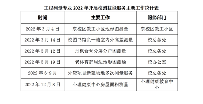 “哪里有技术服务需要,哪里就是技能实践课堂”是工程测量技术专业教学团队的理念,每次接到需求任务,学院积极支持,团队及时响应,科学合理制定技术路线与实践课程安排,组织学生广泛参与,带领学生高标准、严要求的完成任务。通过技能服务不仅为学校建设提供助力,还以此为载体不断丰富了专业技能课程教学体系,也进一步完善了工学结合、德技并修的育人机制。