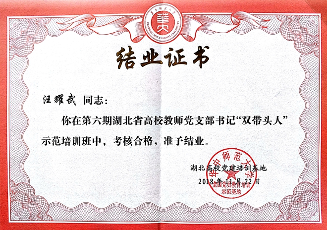 此次培训日程安排紧张、培训内容丰富。在四天的封闭式培训中,汪耀武老师严格遵守培训纪律,认真学习、深入思考。在讨论过程中,对学校支部主题党日的一些特色做法,如围绕“学校创‘特高’,我要怎么做”展开大讨论、围绕党建工作开展“两抓两建一争先”活动等作了交流发言。汪耀武表示,这次培训既是一次学习,更是一次鞭策。在新的起跑线上,将不忘初心、牢记使命,深入领会习近平新时代中国特色社会主义思想,更加热爱党务工作,不断提升业务水平、教研能力,能够在党建工作、学科建设、科学研究等方面起到带头作用,真正成为一名合格的高校教师党支部书记“双带头人”。