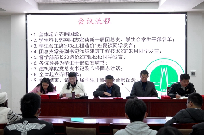 在庄严的国歌声中,大会拉开序幕。会上,舒祖珍对上一届团总支学生会的工作给予了充分肯定,对新一届团总支学生会成员表示热烈祝贺并予以厚望。学生科长郭燕宣读新一届团总支学生会干部聘任名单,与会领导为受聘学生会干部颁发聘书。