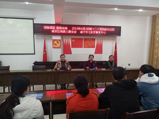 首先,志愿者们给现场的家长朋友们发放自闭症知识的相关传单,让大家了解相关的专业知识。接着,咸宁区残疾人联合会相关负责人以及青龙社区的负责人对自闭症的病因、症状,如何实现自闭症早发现、早治疗、早干预的相关知识做了讲解,并呼吁人们对自闭症患者给予支持和关怀,消除对自闭者的误解和偏见,走进患儿心灵,去聆听他们的声音。最后七彩梦康复中心吕老师讲解了如何应对自闭症儿童以及家长们该怎么样对待这些“问题儿童”。在提问环节中,台下家长发言积极,而台上专家们的专业答疑也赢得了家长们的阵阵掌声。