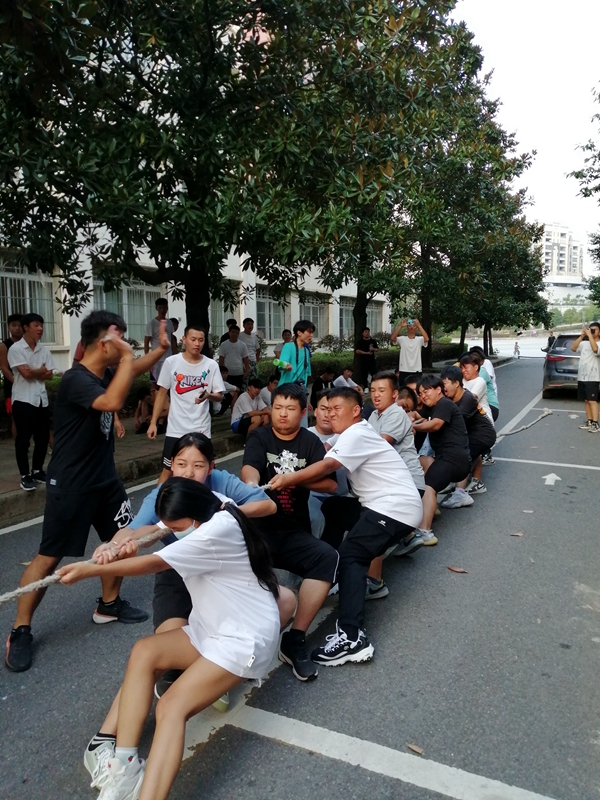 第二个项目是拔河比赛,每队派出15名同学,其中女生不少于2人。比赛的哨声吹响,场上的同学们全都双手紧握绳索,脚靠脚,人挨人,卯足力气向后拉。场下的同学们也积极参与,加油鼓劲的呐喊声此起彼伏,场面激烈而又温暖。