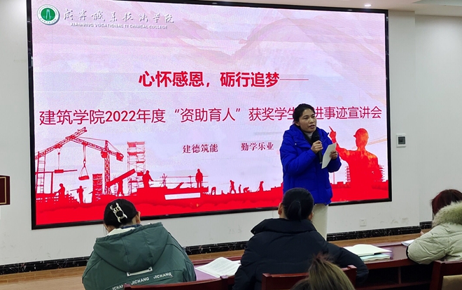 为深入学习贯彻党的二十大精神,全面贯彻党的教育方针,切实做好学生资助工作,大力推进资助育人,把“立德树人”根本任务融入学生资助全过程。2月23日晚,我院在建筑楼210多功能报告厅举行了“2022年度‘资助育人’获奖学生先进事迹宣讲会”,我院党总支副书记郭燕、各年级辅导员及全体2022年度国家奖助学金获助学生参加宣讲会。